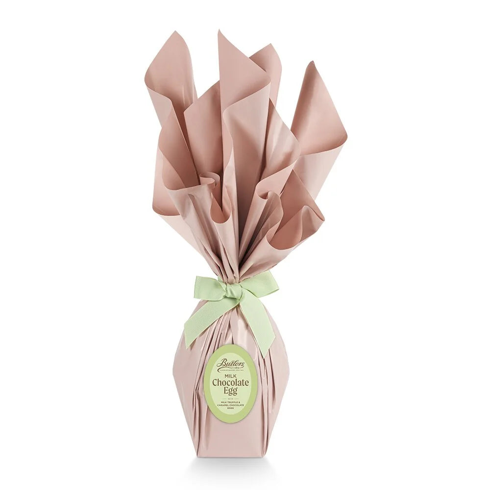 Butlers large milk chocolate hollow egg with mini filled eggs of mini filled eggs in milk chocolate truffle and milk chocolate caramel, wrapped in vibrant pearlised pink recyclable wrap.